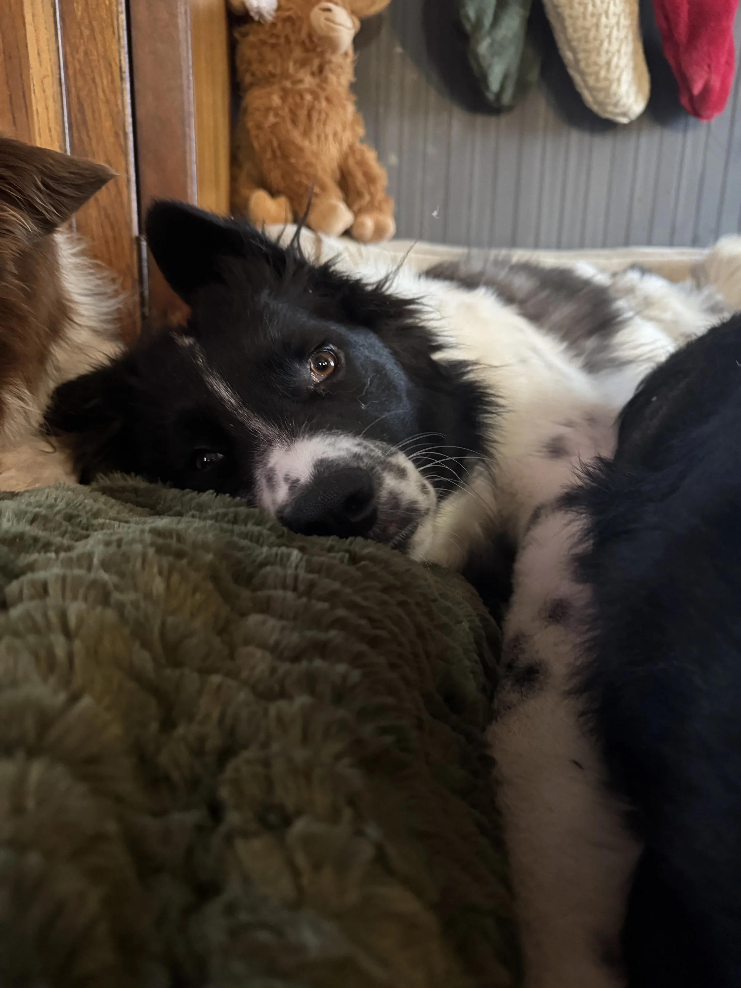 Spider is a gentle soul wrapped in black and white fur, estimated to be 11 months old. This sweet boy is blossoming more every day, slowly learning that human hands can bring love, not harm. Spider has done well with his crate training, potty training, and walking on a leash. He is still learning what he can and cannot chew on. (silly puppies) Currently weighing around 51 lbs, Spider is still gaining much-needed weight and is expected to grow into a large, stunning dog. We believe him to be a Border Collie, Great Pyrenees mix, but we don’t know for sure. With his soft expression and calm presence, he’s well on his way to becoming a loyal, affectionate companion.